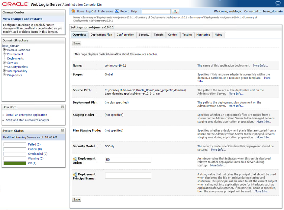Note this document provides instructions on configuring and deploying the Solace JCA 1.5 resource adapter using the web console application of WebLogic, as well as instructions on configuring Solace as a Foreign JMS Provider Module. For detailed background on either Solace JMS or the WebLogic Application Server refer to the referenced documents below.